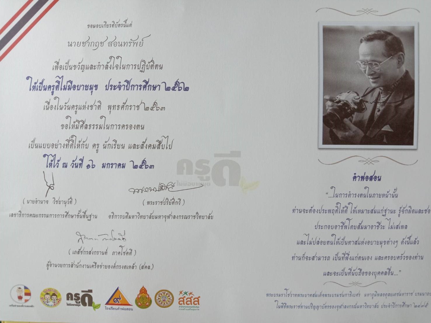 นายชากฤช สอนทรัพย์ รับรางวัล "ครูดีไม่มีอบายมุข"ประจำปี 2562 เนื่องในวันครูเเห่งชาติ 2563 จากสำนักงานเลขานุการการศึกษาขั้นพื้นฐาน