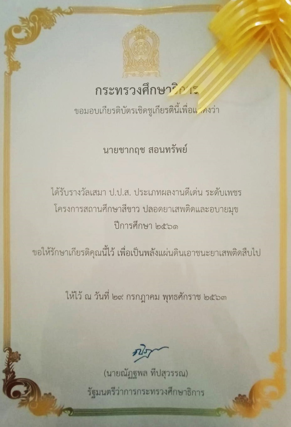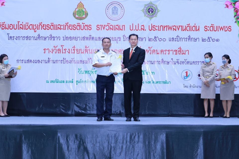 วันพฤหัสบดีที่ 1 ตุลาคม 2563 สำนักงานศึกษาธิการจังหวัดนครราชสีมา ได้รับมอบหมายจาก กระทรวงศึกษาธิการ จัดพิธีมอบโล่รางวัลเชิดชูเกียรติ เสมา ป.ป.ส. ประเภทผลงานดีเด่น ระดับเพชร ระดับชาติ ตามโครงการสถานศึกษาสีขาว ปลอดยาเสพติดและอบายมุข เพื่อยกย่องเชิดชูเกียรติให้กับนายชากฤช สอนทรัพย์ ที่มีผลการดำเนินงานด้านการป้องกันและแก้ไขปัญหายาเสพติดเป็นที่ประจักษ์ โดยมี นายวิเชียร จันทรโณทัย ผู้ว่าราชการจังหวัดนครราชสีมา เป็นประธานในพิธี ณ เทอร์มินอล ฮอลล์ 1 ศูนย์การค้าเทอร์มินอล 21 โคราช อำเภอเมือง จังหวัดนครราชสีมา
